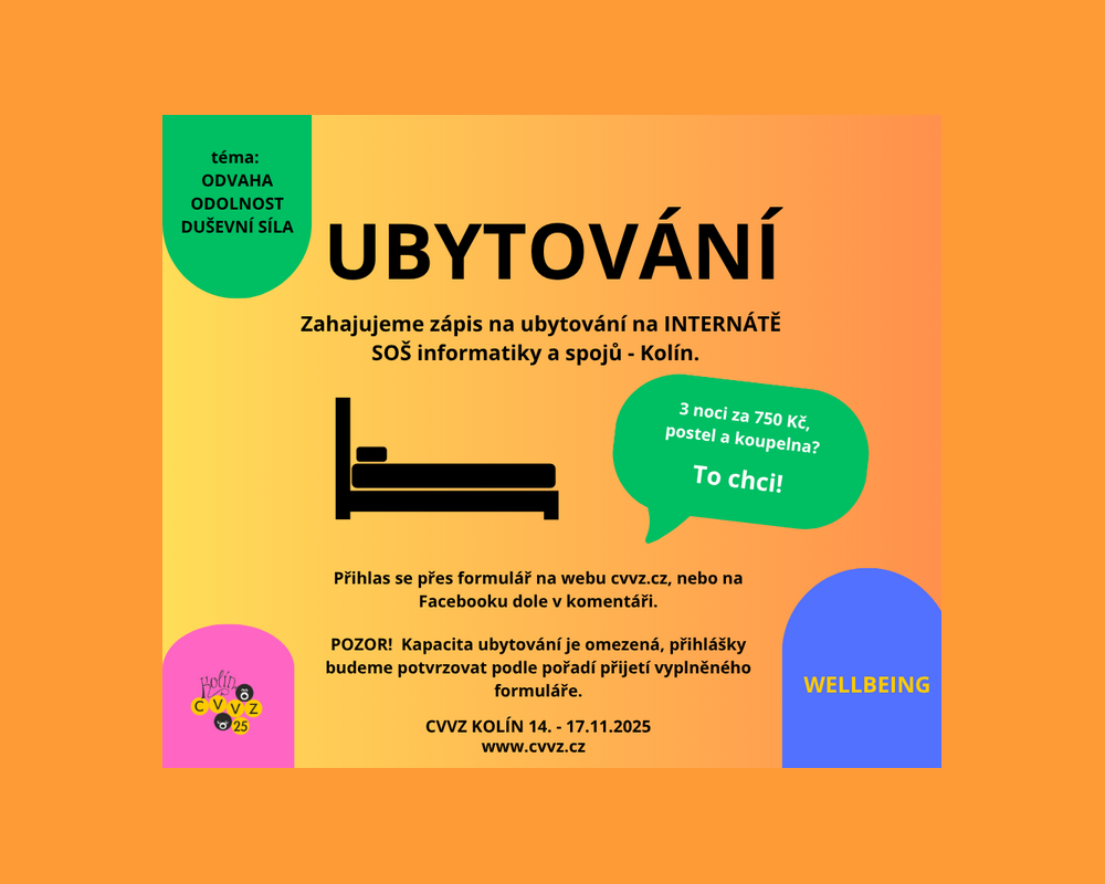 Přečíst článekPro "náročnější" máme za příplatek zajištěno několik lůžek v budově internátu SOŠ informatiky a spojů (Jaselská 826,Kolín), což je jen 8 minut chůze od hlavní budovy ZŠ Lipanská, kde probíhá registrace a většina programů. Cena 750 Kč za 3 noci za 1 lůžko. V případě kratšího pobytu se vždy hradí...