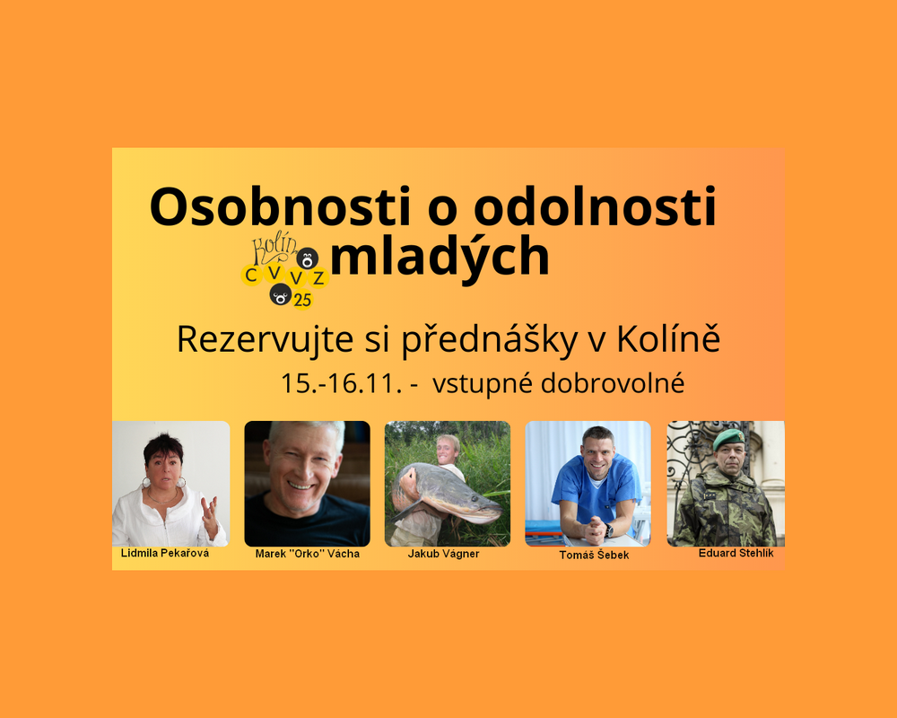 Zveme širokou veřejnost na 5 inspirativních přednášek, na téma „Jak budovat odolnost mladých“. O víkendu 15. až 16. listopadu se můžete těšit ze setkání s významnými osobnostmi, mezi nimiž budou psycholožka Lidmila Pekařová, kněz a biolog Marek Orko Vácha, cestovatel Jakub Vágner, chirurg a humanitární...